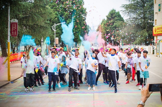 本次彩虹跑的起点设置在学生服务中心门前,沿途经过1号点综合楼门口,2号点耕道院五栋,3号点农职商业街正大门,4号点菜鸟驿站,5号点维新苑门口广场,再到6号点镜台,最后到达终点鸿翼楼,全程距离三千米。五彩粉末飞扬,队伍热情高涨,严格按照规定路线进行。大家时而狂奔,时而嬉闹,时而停下脚步拍照留念,尽管沿途很累很辛苦,但每一个人脸上都洋溢着灿烂的笑容,共同体验了最开心、最多彩、最纵情的狂欢,并在张扬的色彩里分享幸福和喜悦。