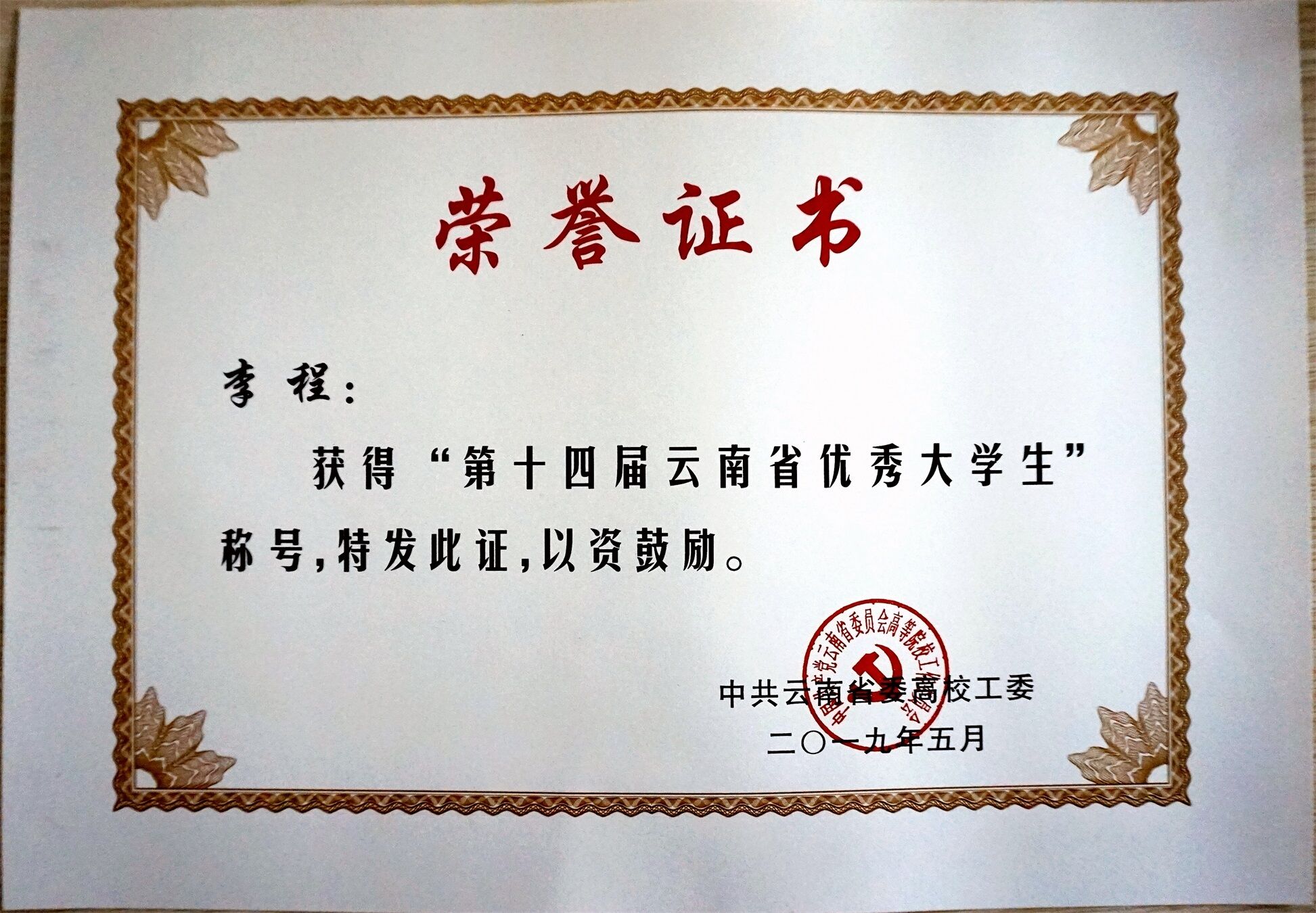 李程同学自2016年入学以来,学习认真刻苦,积极奋进,积极参加各类文体活动,担任工程学院学生会副主席期间认真配合学校的工作安排,组织学院同学积极参与活动,被评为“优秀学生会干部”。在校期间获得国家励志奖学、2017全国中高等院校BIM招投标竞赛中荣获三等奖、2017全国中高等院校BIM招投标竞赛中荣获西部地区二等奖、2017年昆明定向越野联赛第一站、第六站获精英男子组第一名等荣誉。2019年荣获“第十四届云南省优秀大学生”称号。