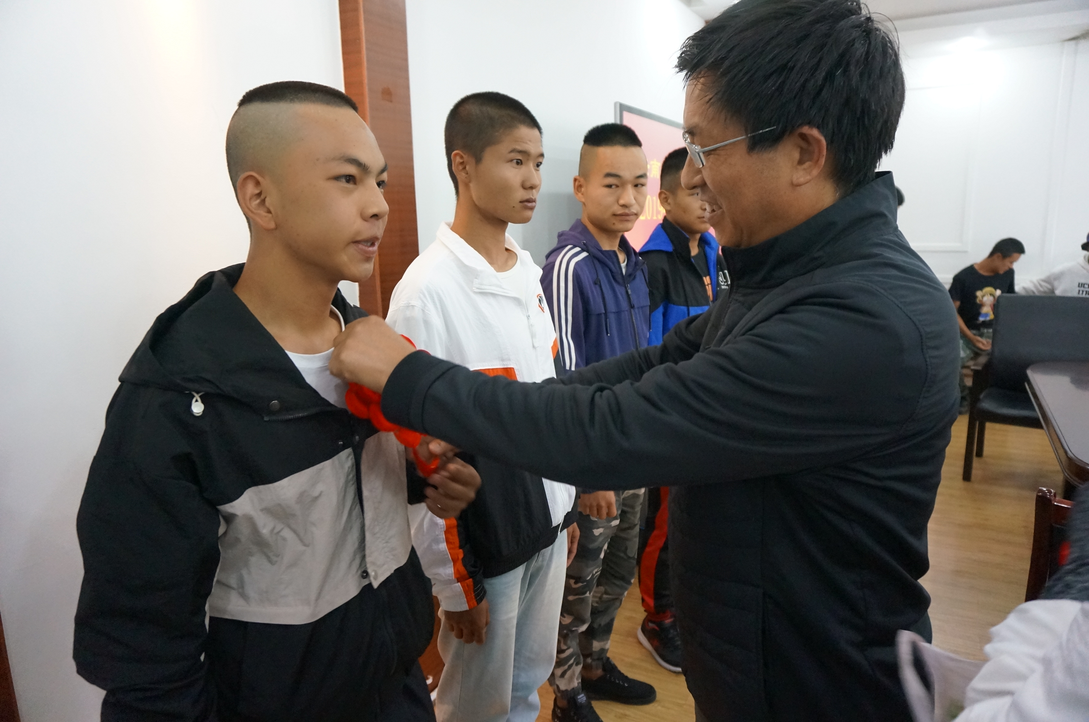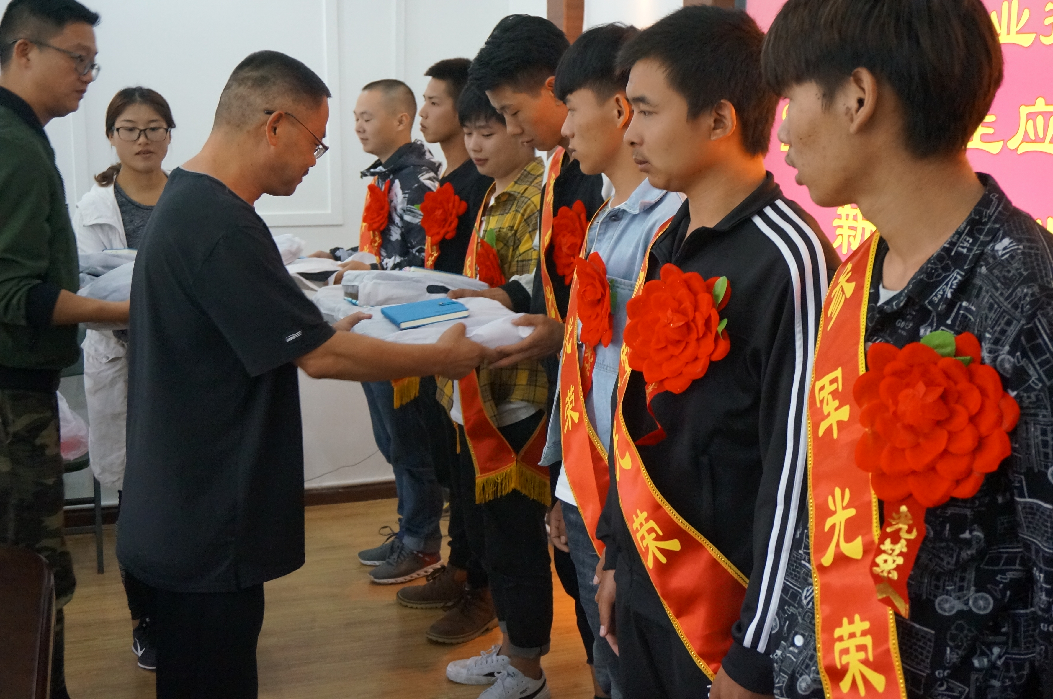 紧接着参会领导为34名优秀新兵佩戴光荣花及颁发纪念品,颁发完毕后,新兵代表刘成树代表各位入伍新兵宣誓,表示进入部队后必将刻苦训练,听党指挥。之后的交流环节里,新入伍同学表达了参军报国的热情、各位领导也对入伍的同学表达了殷切的期望。