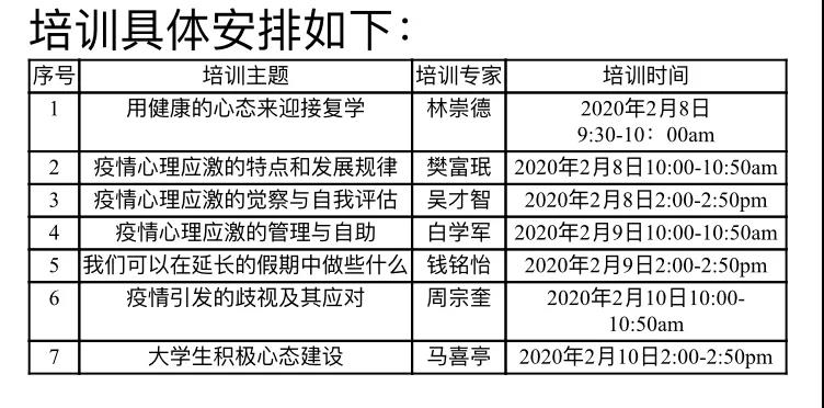 在全国上下共同抗击新型冠状病毒感染肺炎疫情之际,为稳定大学及社会心态,教育部思政司委托全国高校心理健康教育专家指导委员会组织全国知名专家开展大学生心理应激系列讲座。培训时间为2020年2月8日-10日,培训形式为网络直播,培训涉及“用健康的心态来迎接复学”、“疫情心理应激的特点和发展规律”、“疫情心理应激的觉察与自我评估”、“疫情心理应激的管理与自助”、“我们可以在延长的假期中做些什么”、“疫情引发的歧视及其应对”、“大学生积极心态建设”等7个主题,请各单位组织学生准时观看。